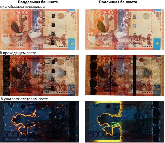 Цветовая гамма поддельной банкноты 5000 тенге отличается от настоящих тусклым цветом.
