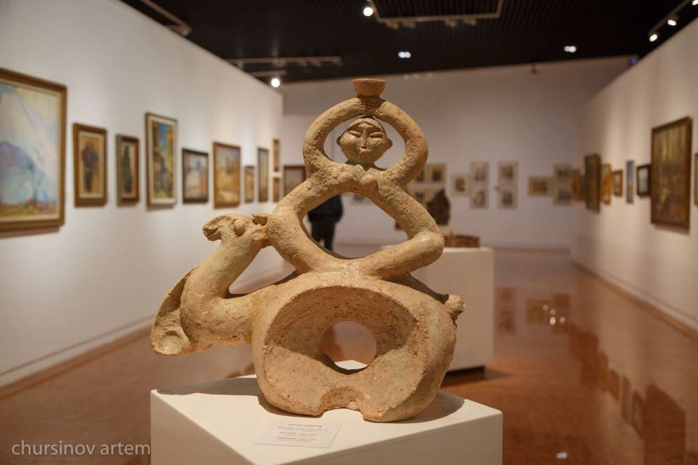 В секции живописи и скульптуре особое место занимает работа в технике французской графики автора Алижана Амантаева. На первой картине изображен сюжет о сакской правительнице Томирис. На второй — рождение золотого человека.