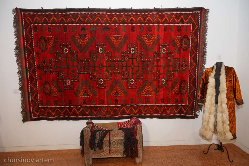 Яркий и насыщенный ковер (сырмак) тоже имеет свою историю. Его создали две девочки-близняшки, которых выдали замуж за парней-близнецов. Невесты собирали его под руководством матери и бабушки для приданного.
