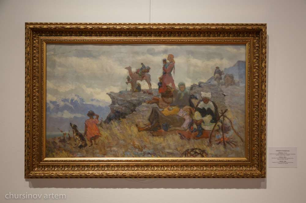 Но не все картины столько радужны, как предыдущие. Картина "Уркун" художника Сабиджана Бабаджанова отражает период голощекинских репрессий 1926 года. Тогда десятки тысяч людей бежали из Казахстана на территории приграничные с Китаем.