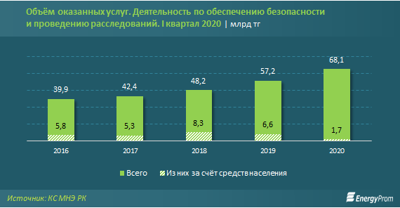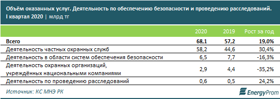 Сразу 85,5 процента от общей суммы услуг в секторе пришлось на деятельность частных охранных служб: 58,2 миллиарда тенге, плюс почти треть. Именно этот сегмент обеспечил рост услуг в целом по сектору.