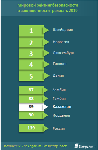 В мировом рейтинге безопасности и защищенности Казахстан занимает 89 строчку из 167. Страна уступает Замбии и Гамбии и на одну позицию обгоняет Иорданию, сообщает BaigeNews.kz со ссылкой на EnergyProm.