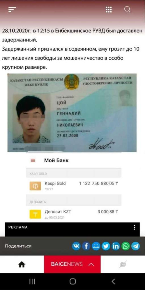 Злоумышленник якобы был задержан и признался в содеянном. В фейковой информации распространяется также удостоверение личности молодого человека и его банковская карта с миллиардом тенге на счете.