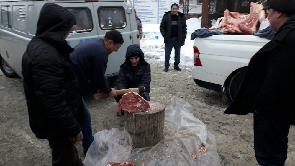 Время работы ярмарки обозначили с 9 утра до 16 часов дня. Первые сельхозтоваропроизводители начали торговлю еще затемно. Мясники не успевали разделывать туши. Поэтому создавались очереди. Цены на мясо приятно радовали - 1000 тенге за кг баранины и 1100 за кг говядины.