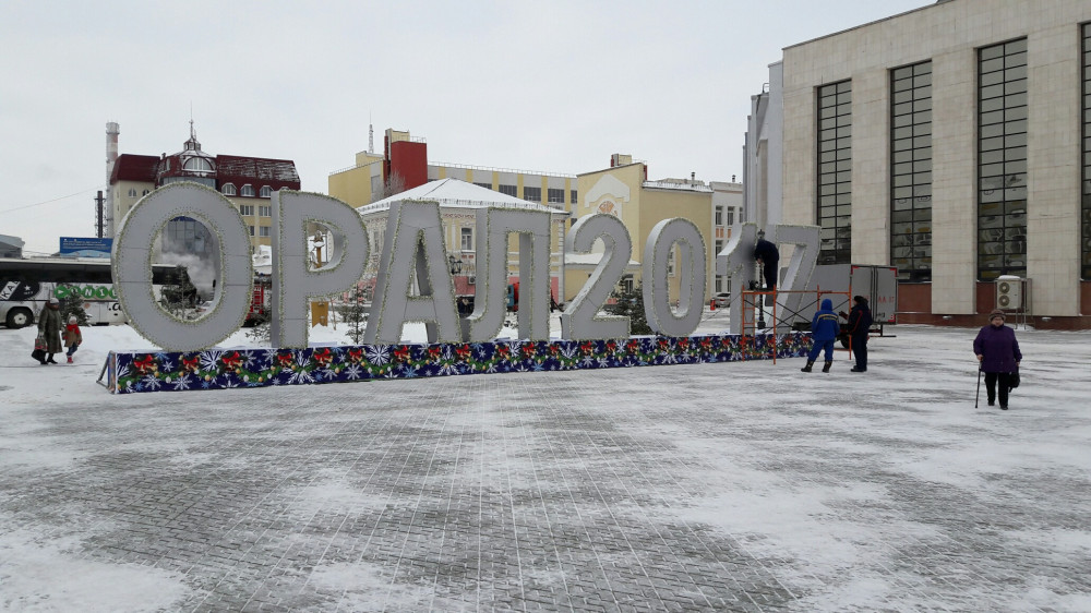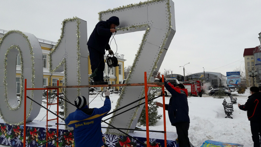 На площади возле областного акимата идет монтаж инсталляции «2017». В городском акимате отметили, что в этом году активное участие в новогоднем оформлении приняли бизнесмены.