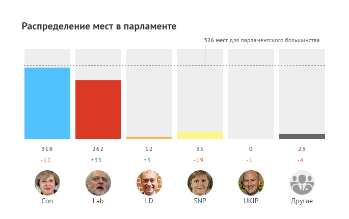 Когда ни одна партия не набирает больше половины мандатов, возникает ситуация «подвешенного парламента» и необходимость создания коалиций. Премьер-министр, лидер консерваторов Тереза Мэй заявила о планах сотрудничества с североирландской Демократической юнионистской партией, однако не уточнила, в какой форме оно будет проходить.