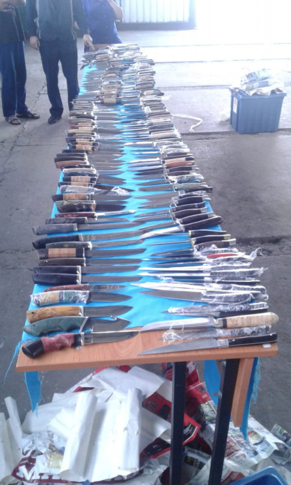 "Сегодня, 8 июня в 9:00, задержаны двое россиян 1989 и 1992 годов рождения, следовавшие по маршруту "Новокузнецк-Алматы". В ходе проверки автомашины "Лада Ларгус", принадлежащей одному из них обнаружены две коробки с разными ножами с общим количеством 442 штуки и граната Ф-1. Со слов задержанных, это муляж учебной гранаты", - сообщили в пресс-службе.