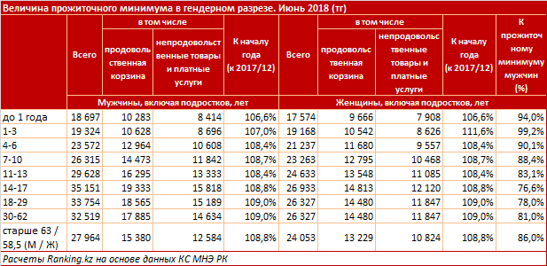 Напомним, в РК считают, что женщинам и мужчинам полагается разный прожиточный минимум: так, трудоспособным женщинам полагается согласно этому показателю на 20,6% меньше продовольствия, а также, соответственно, настолько же меньше непродовольственных товаров и услуг.