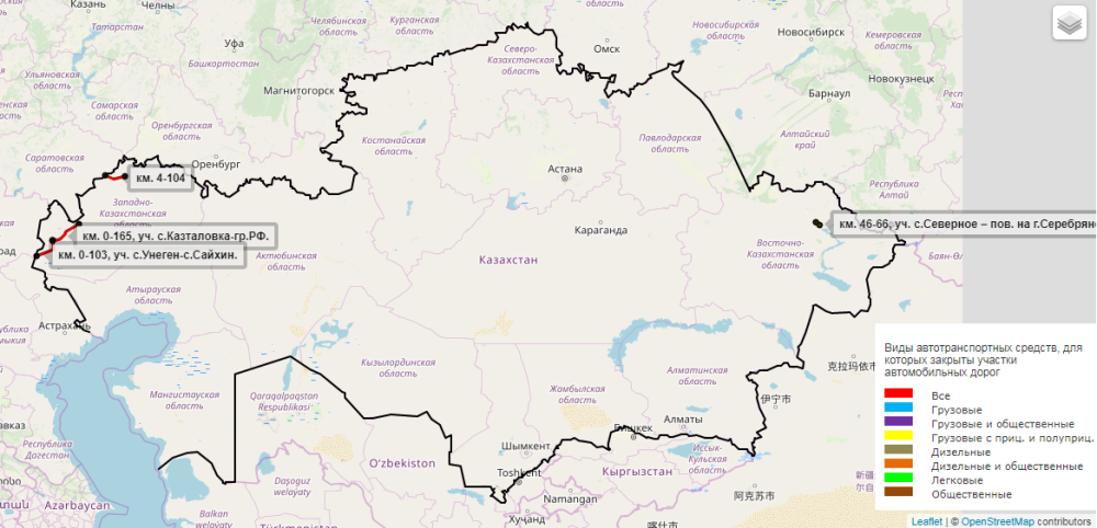 Ограничения движения действуют для всех видов транспорта. Закрыто движение на автодороге республиканского значения Онеге–Бисен–Сайхин (с 0-го по 103-й километр, поселок Онеге–поселок Сайхин), Казталовка–Жанибек–граница РФ (с 0-го по 165-й километр, поселок Казталовка–граница РФ).