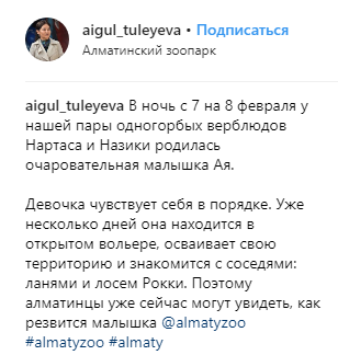 "В ночь с 7 на 8 февраля у нашей пары одногорбых верблюдов Нартаса и Назики родилась очаровательная малышка Ая. Девочка чувствует себя в порядке. Уже несколько дней она находится в открытом вольере, осваивает свою территорию и знакомится с соседями: ланями и лосем Рокки. Поэтому алматинцы уже сейчас могут увидеть, как резвится малышка", - рассказала Тулеева.