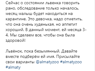 Как отметила Айгуль Тулеева на своей странице в Instagram, сейчас о состоянии львёнка говорить рано.