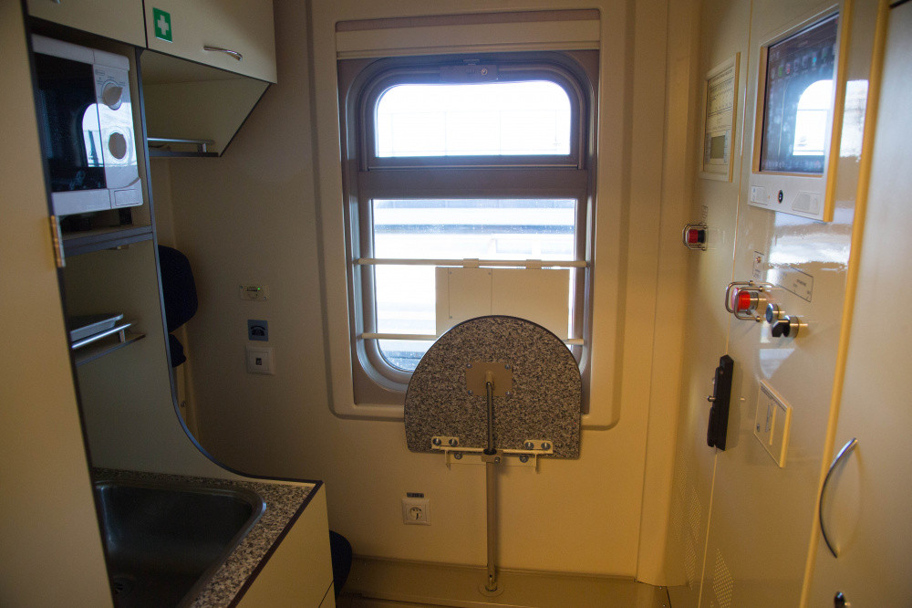 "Кроме того, вагоны оснащены системой видеонаблюдения, предусматривающей шесть видеокамер, расположенных в служебного купе проводника, коридорах и тамбурах, работающих в цветном режиме, обеспечивающих просмотр в реальном времени на экране монитора штабного вагона. В каждом купе и коридорах установлены по 2 электрические розетки напряжением 220В и по 2 современным USB порта для зарядки мобильных телефонов. Также имеется холодильник для проводника, микроволновая печь, диспенсер c питьевой и титан с горячей водой",- говорится в сообщении пресс-службы.