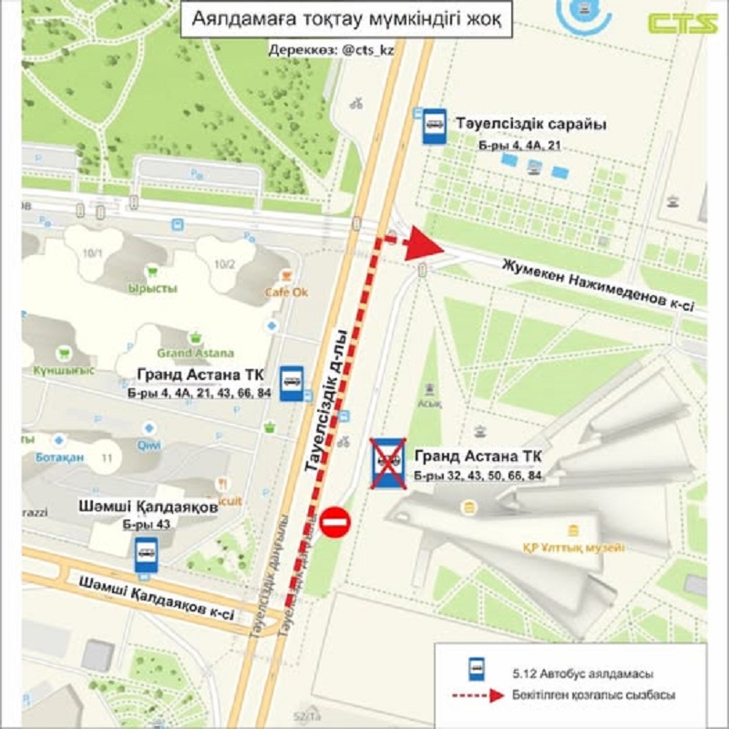 "Уважаемые пассажиры! Маршруты №№32, 43, 50, 66 и 84 временно не останавливаются на остановке "Гранд Астана ТК". Просим заранее планировать свой маршрут", - говорится в информации.