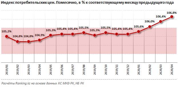 Напомним, инфляционный коридор регулятора — Нацбанка — составляет 4–6 процентов, то есть уже два месяца показатель выбивается за рамки. На инфляцию повлияли как пандемия COVID-19 и связанный с нею мировой кризис, так и девальвация тенге в результате падения цен на нефть.