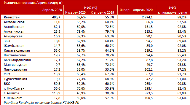 За январь–апрель объемы розничной торговли составили 2,87 триллиона тенге — на 5,9 процентов меньше, чем за первые четыре месяца прошлого года. Реальное сокращение объёмов достигло 11,8 процентов. В минусе абсолютно все регионы РК, без исключения.