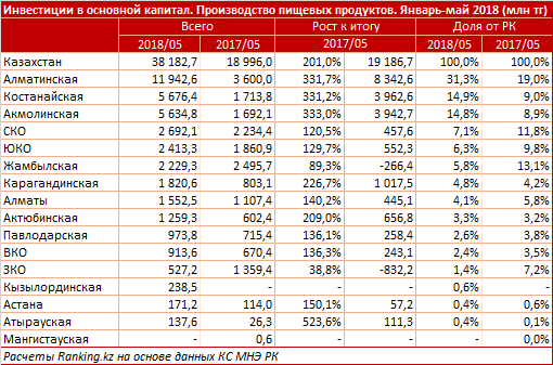 По итогам пяти месяцев в пищевую промышленность Казахстана вложили 38,2 млрд тенге, что в два раза больше, чем годом ранее. Наибольший объем инвестиций пришелся на Алматинскую (31,3% от РК) и Костанайскую (14,9% от РК) области, сообщает Ranking.kz.