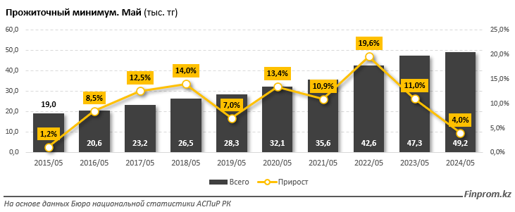 В мае текущего года прожиточный минимум в Казахстане составил 49,2 тыс. тг в среднем на душу населения — на 4% больше, чем годом ранее, передаёт BaigeNews со ссылкой на Finprom.