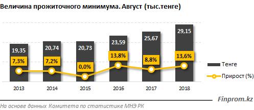 В августе прожиточный минимум в Казахстане достиг 29,15 тыс тенге, что на 13,6% больше, чем год назад. За последние пять лет это самый высокий темп годового роста в соответствующих периодах, говорится в исследовании Finprom.kz.