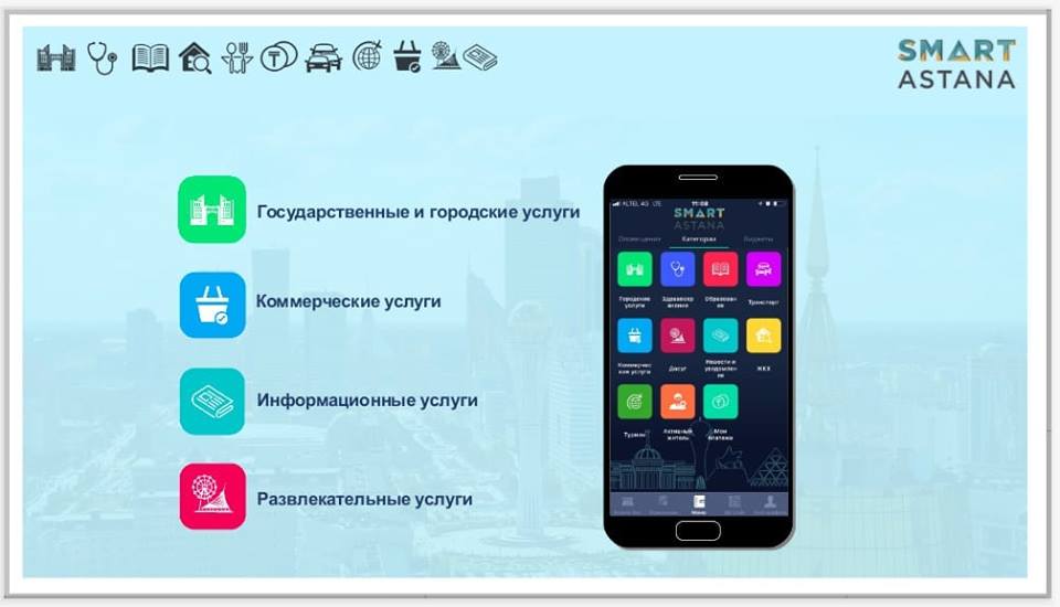 На сегодняшний день приложение Smart Astana включает 8 категорий и 66 городских сервисов и услуг, сервис оповещений и уведомлений, 10 коммерческих информационных услуг, два новостных портала - Елорда Ақпарат и МИА "Казинформ". Идёт работа над развлекательным контентом. Кроме того, с июля текущего года через приложение можно найти работу в столице. Программа интегрирована с порталом enbek.kz, где актуальные вакансии обновляются ежедневно.