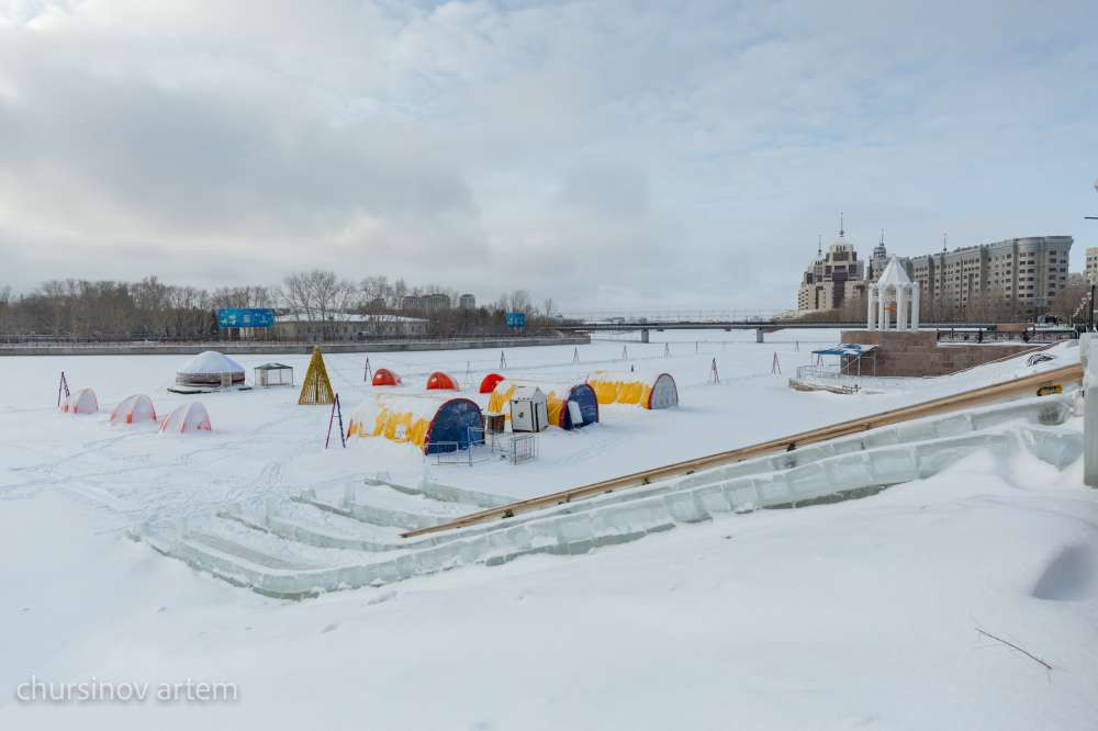 Прогуливаясь по аллее, можно пройти на набережную реки Есиль. Здесь можно скатиться с ледяной горки и прямиком попасть в мини-городок эскимосов. Его построили на застывшим льду на реке Есиль, где можно почувствовать настоящую атмосферу зимы. Все развлечения для посетителей бесплатные.