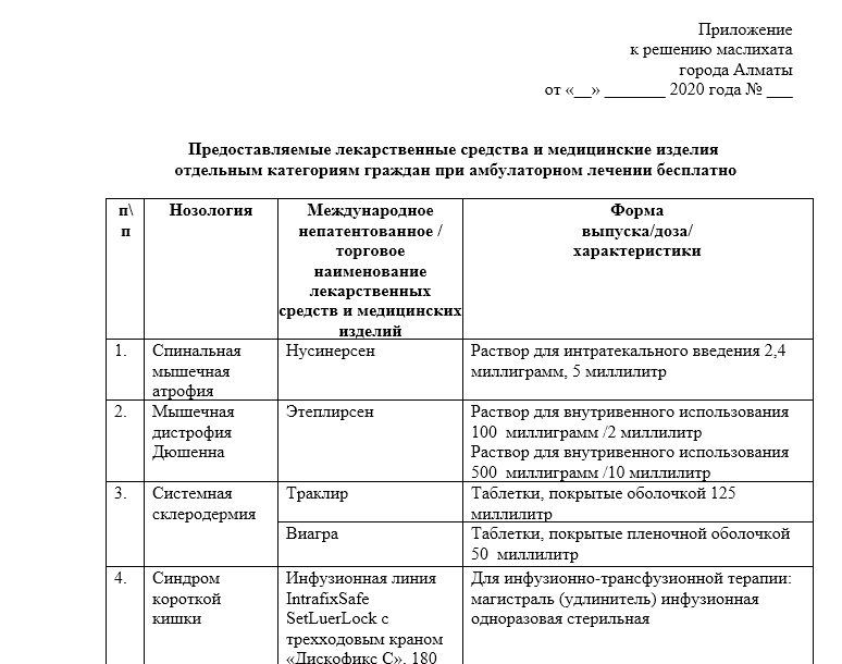 Приложение к решению маслихата содержит список лекарственных препаратов и медицинских изделий для лечения четырех нозологий.