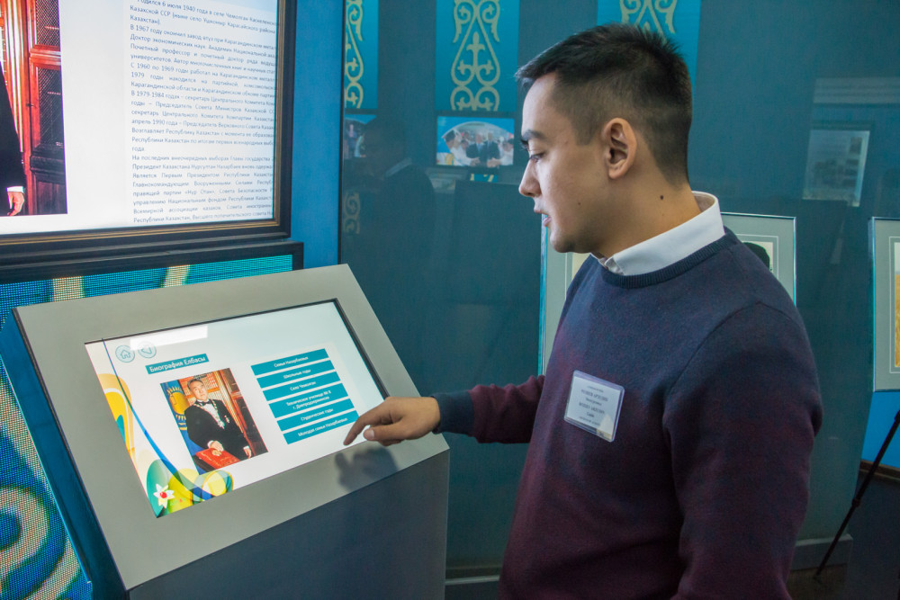 Например, в таких информационных киосках посетители могут узнать о биографии Елбасы, посмотреть уникальные фотографии из школьной и студенческой жизни будущего главы государства.