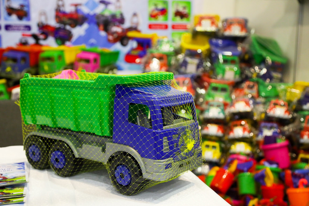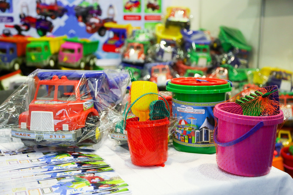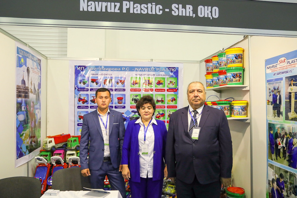 Индивидуальный предприниматель Рабига Байтемирова из Шымкента занимается первичным производством детских пластмассовых игрушек. Директор фабрики Шухрат Юлдашев рассказал, что предприятие принимает участие в выставке отечественных товаропроизводителей с 2015 года. По его словам, в самом начале никто не мог поверить, что производство таких игрушек возможно в Казахстане, учитывая, что обычно товары такого рода импортируют из других стран.