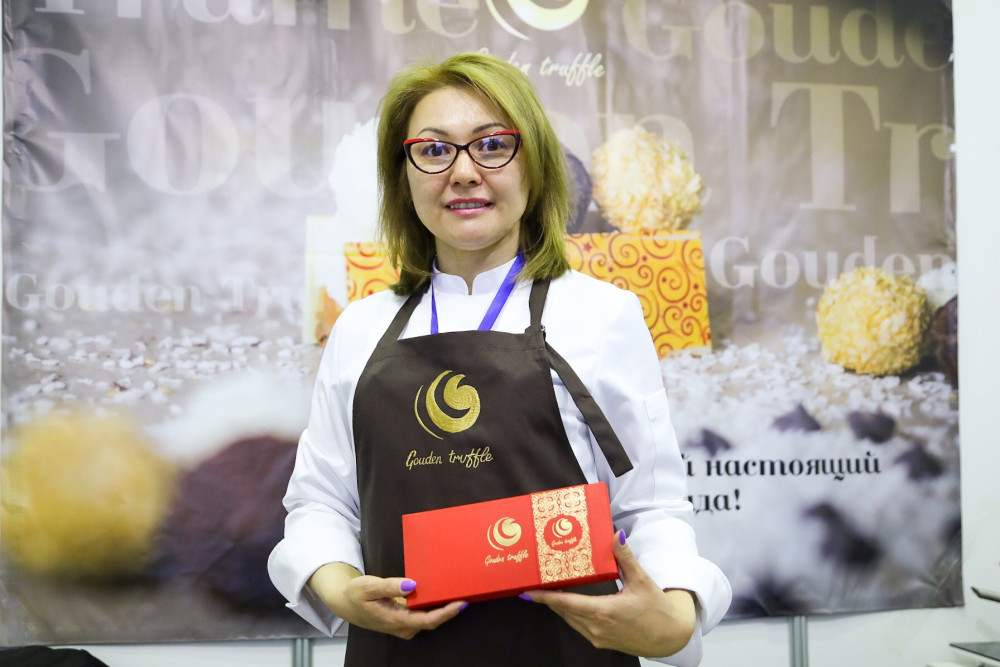 Владелица семейного бизнеса ИП Шоколадная мастерская Gouden truffle Алтынай Рыскулова рассказала, что столичное предприятие находится на рынке уже год, в выставке Фонда "Даму" участвует впервые.