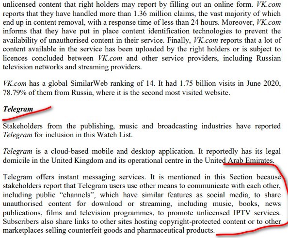 Список основан на отчётах групп правообладателей и включает четыре категории площадок: онлайн-сервисы, предоставляющие доступ к пиратскому контенту; платформы электронной торговли; онлайн-сервисы, занимающиеся распространением лекарств; физические торговые площадки. VK и Telegram вошли в первую группу в раздел соцсетей.