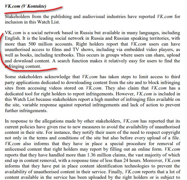 Еврокомиссия отмечает, что у российской соцсети есть инструменты для ограничения доступа к нелегальным файлам, но добавляет, что её включили в список из-за большого числа сообщений о нарушении авторских прав.