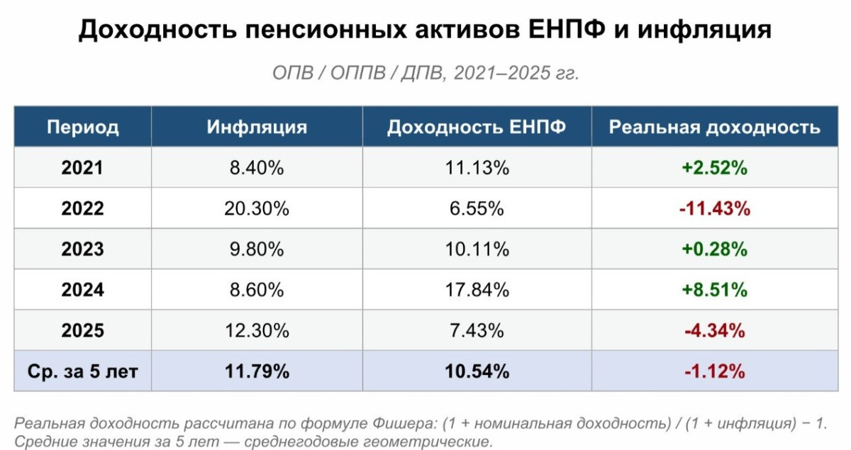 Предоставил нам Нацбанк и данные по доходности за последние пять лет в купе с инфляцией. Тут ситуация ожидаемо - нестабильная. Только три года были в плюсе: 2021, 2023 и особенно удачный 2024 год. В остальные же годы инфляция заметно съедала накопленные активы казахстанцев. Хуже всего было в 2022 году, когда начался геополитический хаос. Чтобы рассчитать реальную доходность мы использовали формулу Фишера.