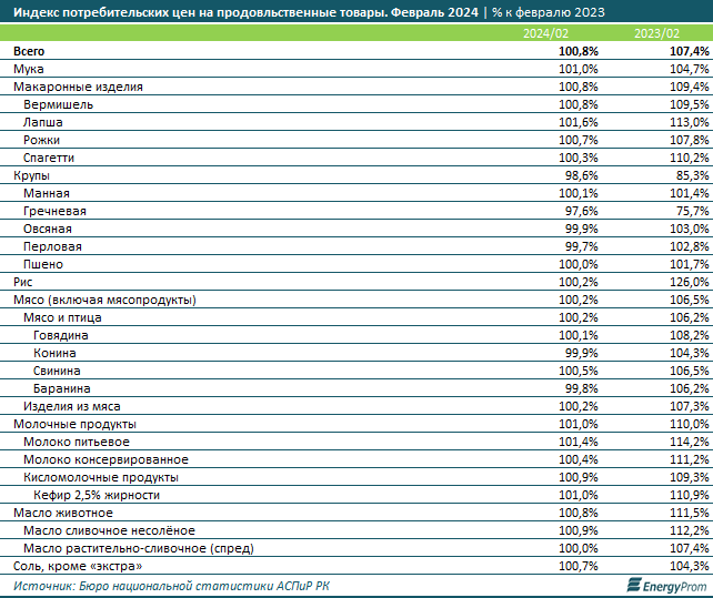 По итогам февраля текущего года в целом продовольственные товары подорожали на 0,8% за месяц и на 7,4% за год. В том числе мука подорожала на 1% за месяц и на 4,7% за год, макаронные изделия — на 0,8% за месяц и на 9,4% за год, мясо и мясопродукты — на 0,2% за месяц и на 6,5% за год, молочные продукты — на 1% за месяц и на 10% за год, животные масла — на 0,8% за месяц и на 11,5% за год, соль — на 0,7% за месяц и на 4,3% за год. А вот крупы подешевели на 1,4% за месяц и на 14,7% за год.
