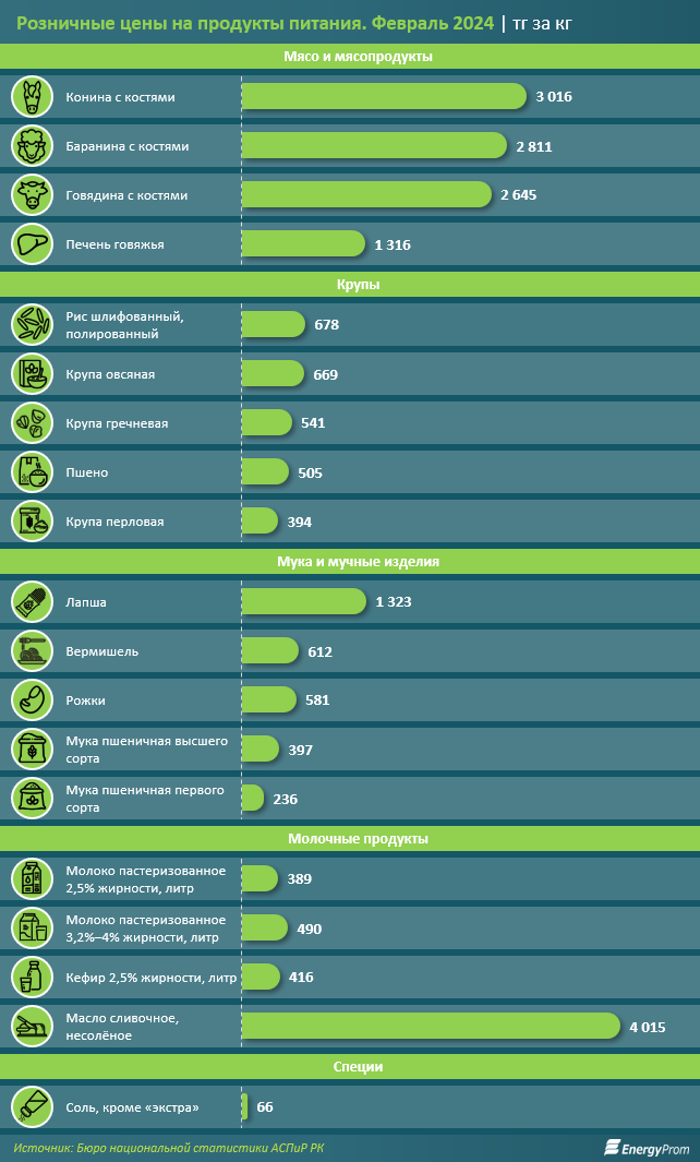 В секторе молочных и кисломолочных продуктов пастеризованное молоко 2,5% жирности стоило 389 тг за литр, а 3,2%–4% жирности — 490 тг за литр. Кефир 2,5% жирности обходился по 416 тг за литр, сливочное масло стоило 4 тыс. тг за кг.