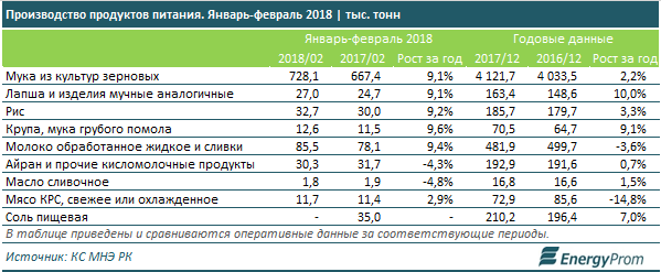 По итогам января-февраля казахстанские производители продуктов питания нарастили на 9,1% год-к-году выпуск муки (до 728,1 тыс. тонн), как и лапши и прочих макаронных изделий (до 27 тыс тонн).