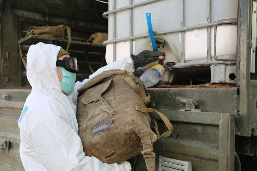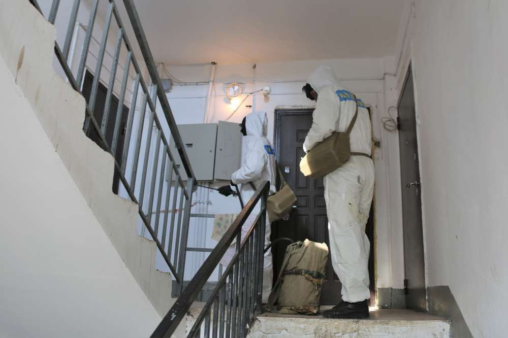 На сегодняшний день к работам по дезинфекции привлечено около 100 военнослужащих. Они разделены на 5 групп по 20 человек. Обработку проводят с применением индивидуальных дегазационных комплектов ИДК-1. Комплект работает методом распыления. На один подъезд в среднем уходит порядка 20 литров раствора.