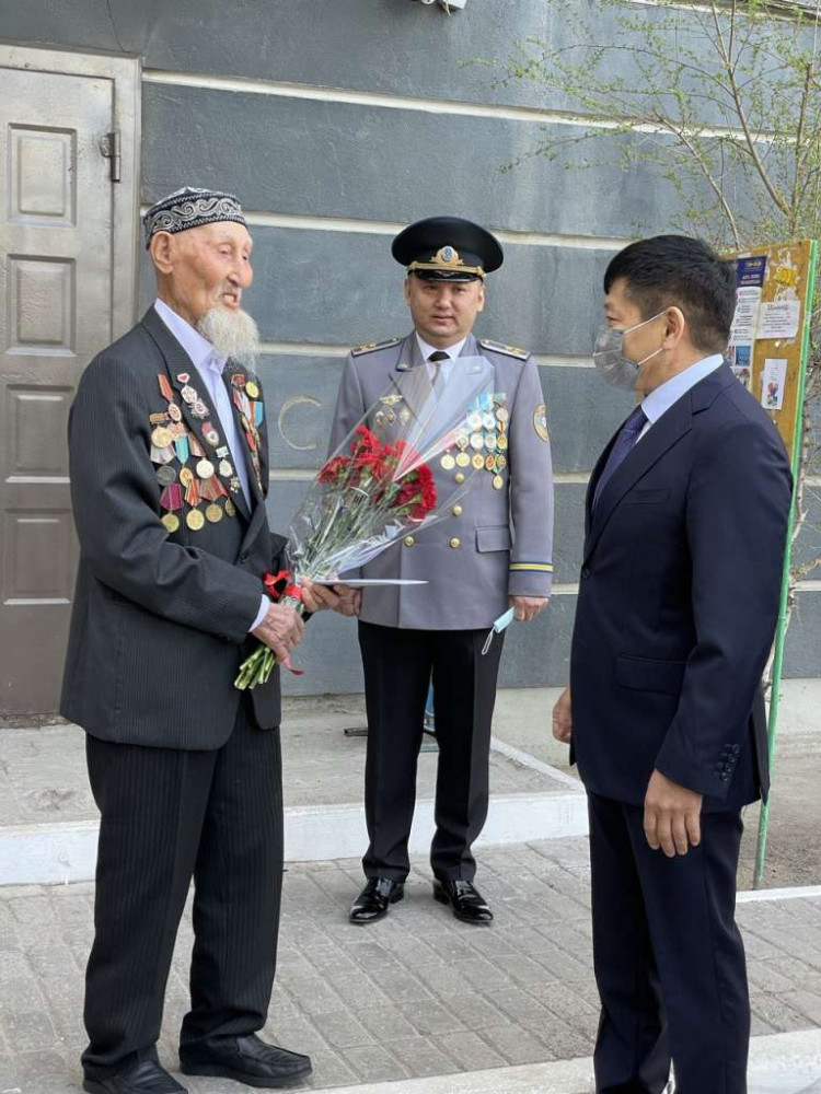 Заместитель начальника СГО РК генерал-лейтенант Талгат Мухтаров лично поздравил Жакан-ата и пожелал ему крепкого здоровья.