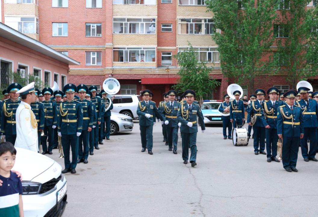 Военнослужащие управления начальника Тыла, воспитанники военно-патриотического клуба "Жас сарбаз" и музыканты Центрального оркестра Национального военно-патриотического центра Вооруженных сил РК подготовили для ветерана сюрприз.