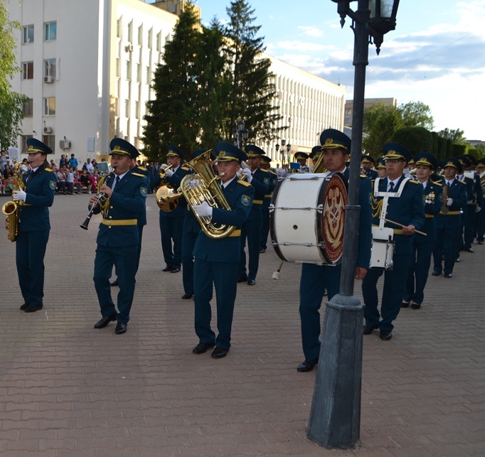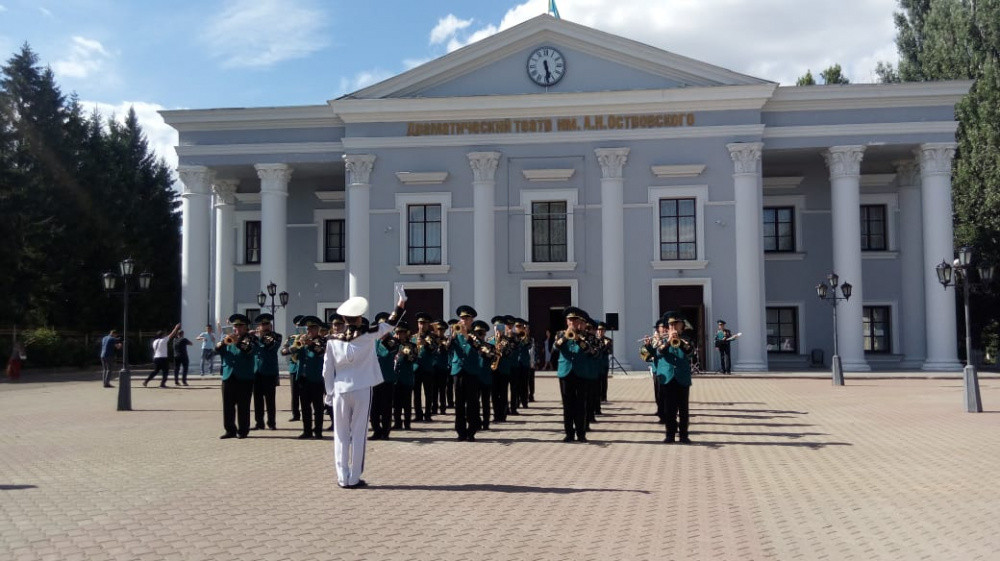 Импровизированный двухчасовой праздничный концерт сводного военного оркестра РгК "Батыс" состоялся на Арбате перед Драматическим театром А. Островского, став настоящим сюрпризом для жителей и гостей города.