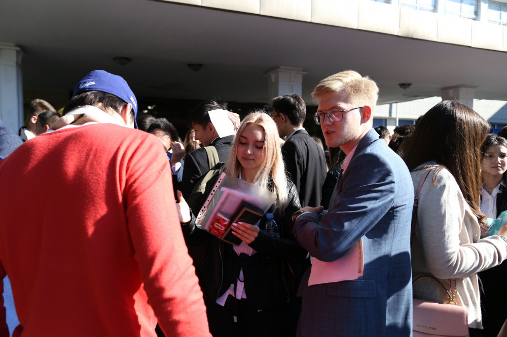 Официально тестирование стартовало в 9:30, однако собираться у стен национального вуза дети и их родители начали уже в 8:00 утра. Стоит отметить, что настроение у участников тестирования было приподнятое, несмотря на всеобщее волнение. Дети делали групповые снимки на память, стараясь запечатлеть момент, который может стать решающим в их жизнях.