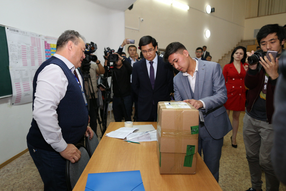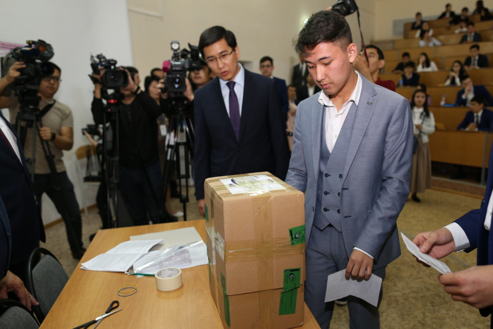В одной из аудиторий до начала экзамена в присутствие министра, ректора ЕНУ и представителей средств массовой информации несколько учеников, вызванные из аудитории следят за процессом вскрытия бокса с тестовыми заданиями для ЕНТ. После этого каждый получил свой экземпляр и начал работу в назначенный срок.