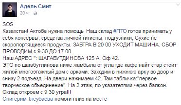 Сообщение с просьбой о помощи акюбинцам разместила на своей странице в Facebook волонтер Адель Смит.