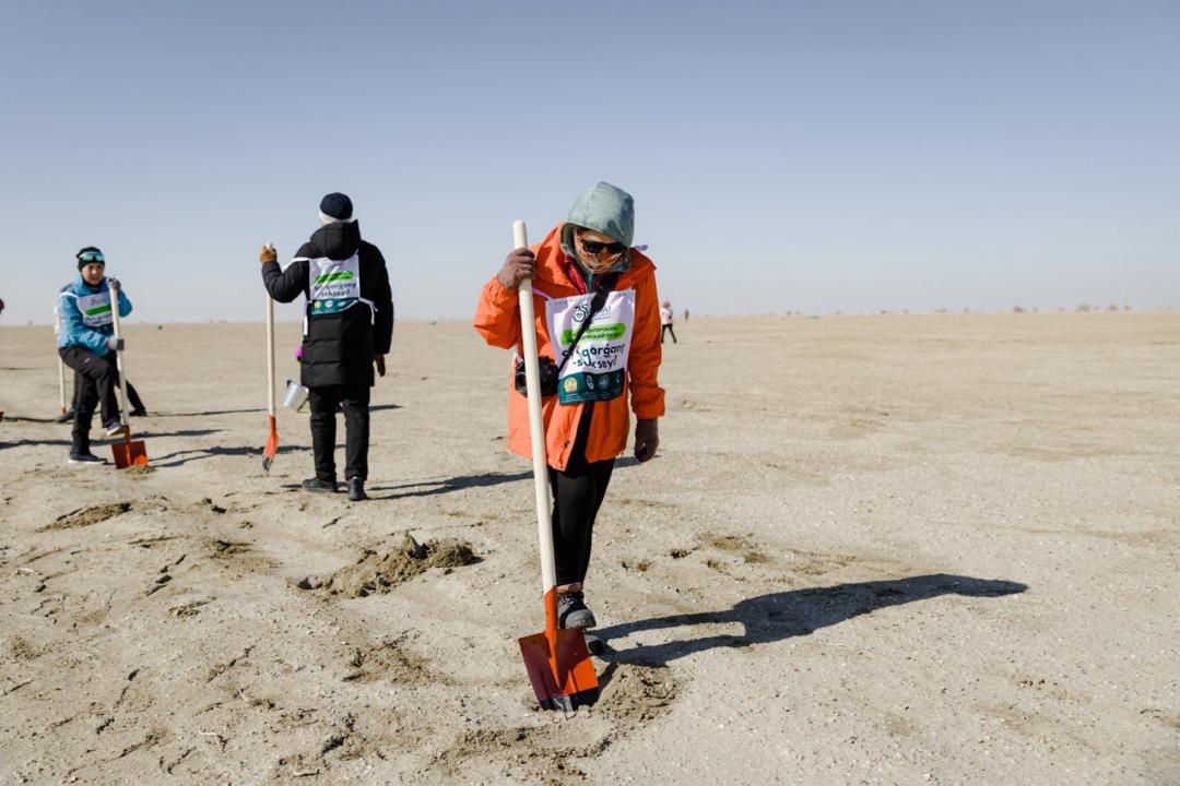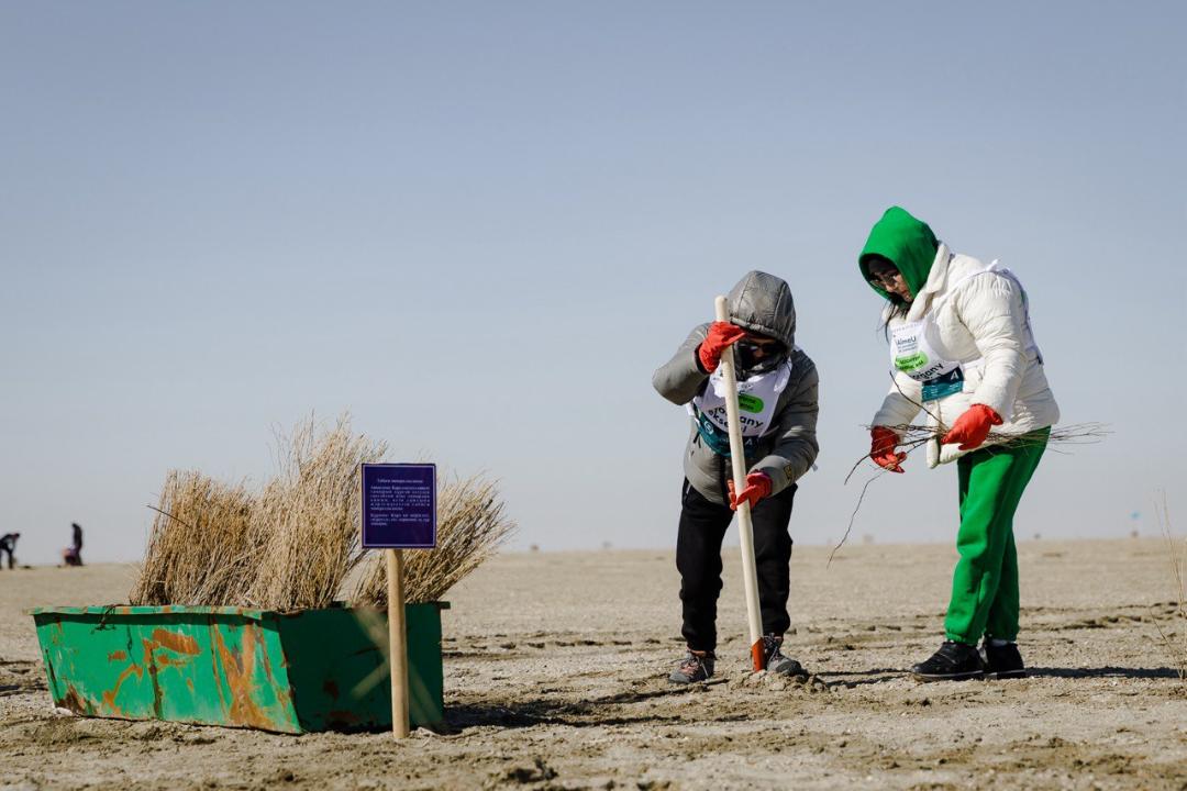 "Идёт посадка саксаула на площади один миллион 100 тысяч гектаров.С 2021 по 2023 годы саксаул был посажен на 545 000 гектаров земли. Теперь осталась половина работы. Прибытие волонтёров на Арал – поистине историческое событие. До этого было много доноров из-за рубежа - Южной Кореи, Германии, Америки. Саксаул – священное дерево, который не берёт ни топор, ни пила. До 4 тонн песка и соли могут удерживать корни одного куста. В нашей стране растёт самое большое количество саксаула. В Кызылординской области, Мойынкуме, Созаке и даже на Балхаше можно встретить саксаул. Существует два типа растения: чёрный и белый. Посажен именно чёрный саксаул. Мы посадили саженец после того, как он был полностью пропитан болтушкой. Саксаулу достаточно влаги и минерального питания, так как болтушка состоит из гидрогеля и навоза. В связи с этим нет необходимости поливать саженцы. И уже через четыре года они дадут семена", - сказал спикер.