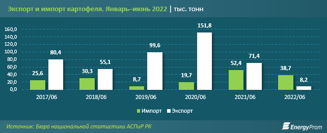 Несмотря на увеличение объёма сбора и урожайности картофеля в 2021-м, в первом полугодии 2022 года импорт картофеля впервые превысил экспорт: в 4,7 раза — 38,7 тысячи тонн против 8,2 тысячи тонн.