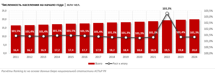 На начало текущего года население РК составляло 20 миллионов человек - на 1,3 процента больше, чем годом ранее. Численность населения растёт постепенно, примерно на 1,3–1,5 процента ежегодно, за исключением 2022-го - года "посткарантинного" беби-бума, когда прирост населения составил очень значительные 3,3 процента.