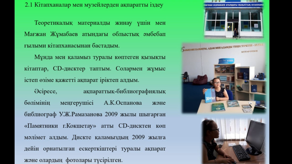 Айлана работала под чутким руководством своего куратора Калемшарив Карахат. Работать, надо сказать, было непросто: информации о памятниках не так много. И она, в основном, на русском языке. Перевести сведения на казахский и систематизировать девочке помогла мама. Автор старалась связывать историю памятников с событиями в Отечестве.