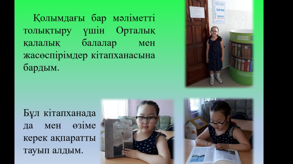 В библиотеку им. М.Жумабаева передан электронный вариант книги – после заключения договора об авторском праве. Также Айлана подготовила макеты памятников – для родной НИШ, чтобы учителя могли демонстрировать их на уроках. А еще второклассница подготовила цикл познавательных рубрик для детской передачи "Жулдызай" на местном телевидении.