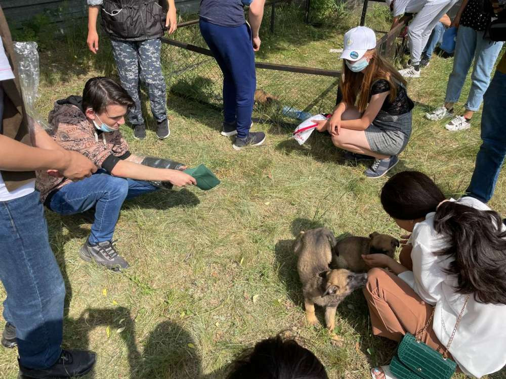 Далее ребят пригласили познакомиться с щенятами, которые в будущем также будут обучены к поисковой службе. Дети брали их на руки и игрались с ними. Затем самый шустрый из всех щенят унес кепку одного из воспитанников. Долгое время все наблюдали за этим процессом: кто-то громко смеялся от радости, кто-то пытался записать это на видео.
