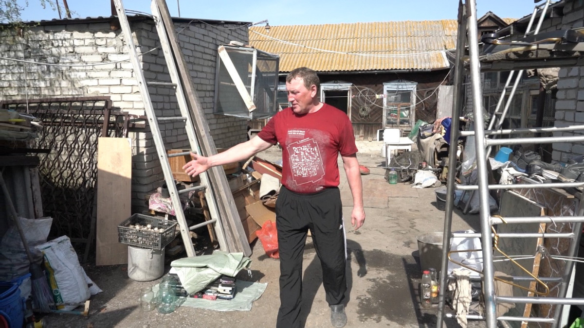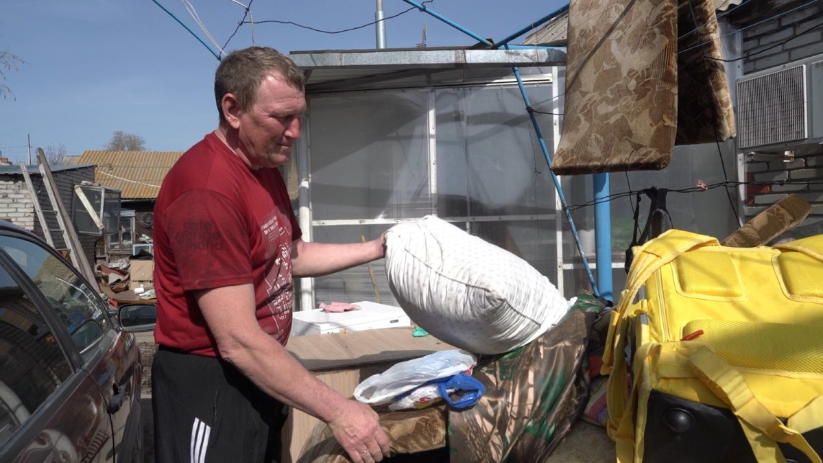 Костанаец Александр Ситников ни на день не покидал свой дом, даже когда он ушёл под воду. Разбил палатку на крыше гаража и караулил, чтобы мародёры не зашли. Теперь вынес мокрые вещи на улицу и сушит то, что еще можно спасти.