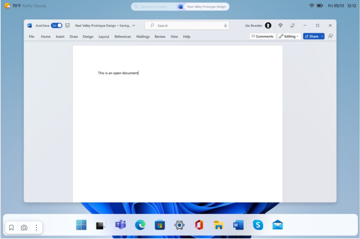 Здесь очень хорошо видно, что панель задач визуально отделена от нижней части экрана и будто бы парит над обоями, в левом верхнем углу появится виджет с погодой, а системные значки (дата, время, заряд аккумулятора, уровень сигнала Wi-Fi) переместились с нижней правой части экрана вверх. По центру вверху размещена строка поиска.