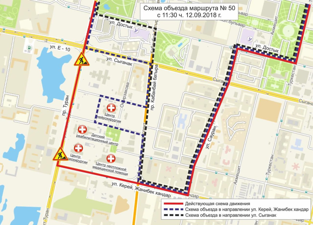 Маршрут № 50 – от начального остановочного пункта "Детский сад "Бал бала" до пересечения улицы Сыганак – проспект Туран без изменения, далее – налево на улицу Сыганак, направо на проспект Кабанбай батыра с заездом в район медицинских учреждений, налево на улицу Керей и Жанибек хандар, далее – согласно действующей схеме движения.